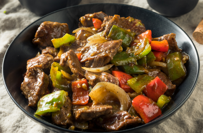 Tender beef strips cooked with peppers in a savory sauce.